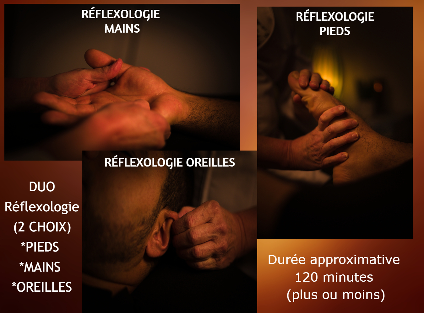 Variante du soin précédent axée sur les mains ou les oreilles (1h45). L'ajout des techniques énergétiques (méridiens ou points neuro-vasculaires) vient amplifier la détente et l'action thérapeutique, offrant un soulagement ciblé et une grande détente psychologique.