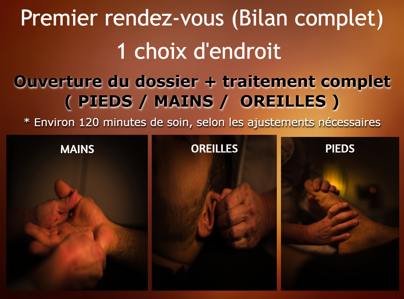 L'expérience la plus exhaustive pour un nouveau client (2h30). En plus de l'ouverture de dossier et de la réflexologie, nous ajoutons 30 minutes dédiées au travail des méridiens ou des points neuro-vasculaires. C'est le choix optimal pour attaquer une problématique complexe dès la première visite.